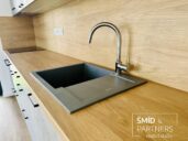 V bytě je již dokončena instalace kuchyňské linky, světel a zrcadla v koupelně.